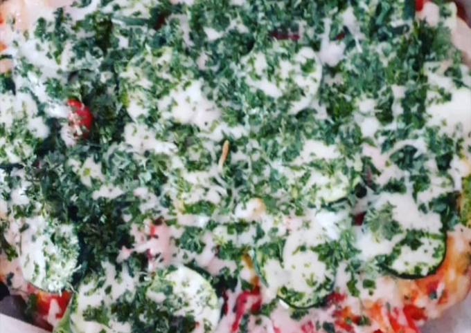 - Der Pizzateig wird mit 1000 g Roggenmehl und lauwarmem Wasser und Milch, Olivenöl, frischer Hefe, Haferflocken, Backpulver und Salz in einer Rührschüssel hergestellt und gut durchgeknetet. Pizzateig etwas ruhen lassen und dann ausrollen. Pizzaboden einstreichen mit Pizzasoße und belegen mit Zucchini, Tomaten, Zwiebeln, Paprika, Rucola und Mozzarellakäse und Petersilie..