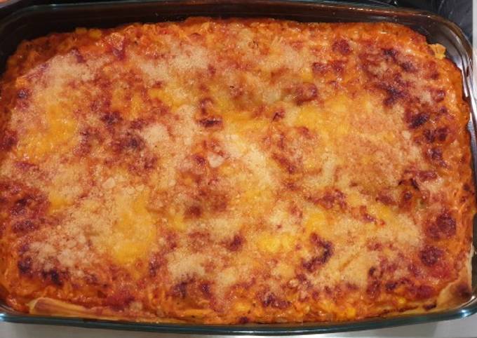 - In eine gefettete Auflaufform eine Schicht Blätterteig geben und dann die Sauce, Cheddarkäse und Mozzarella darüber..